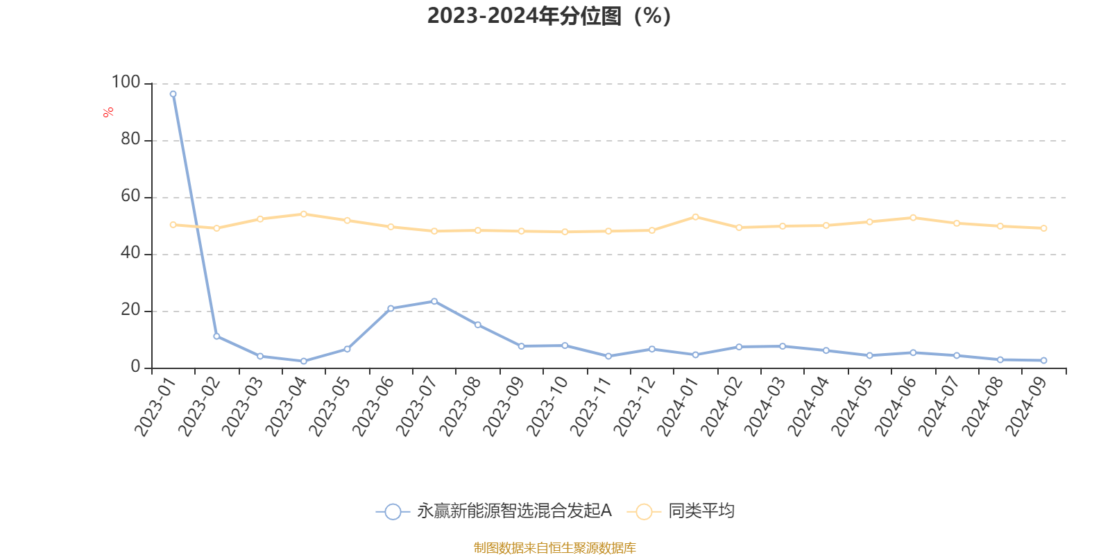 通过所选区间该基金净值增长率分位图,可以观察该基金与同类基金业绩比较情况。图为坐标原点到区间内某时点的净值增长率在同类基金中的分位数。