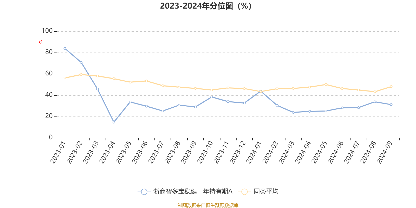 通过所选区间该基金净值增长率分位图,可以观察该基金与同类基金业绩比较情况。图为坐标原点到区间内某时点的净值增长率在同类基金中的分位数。