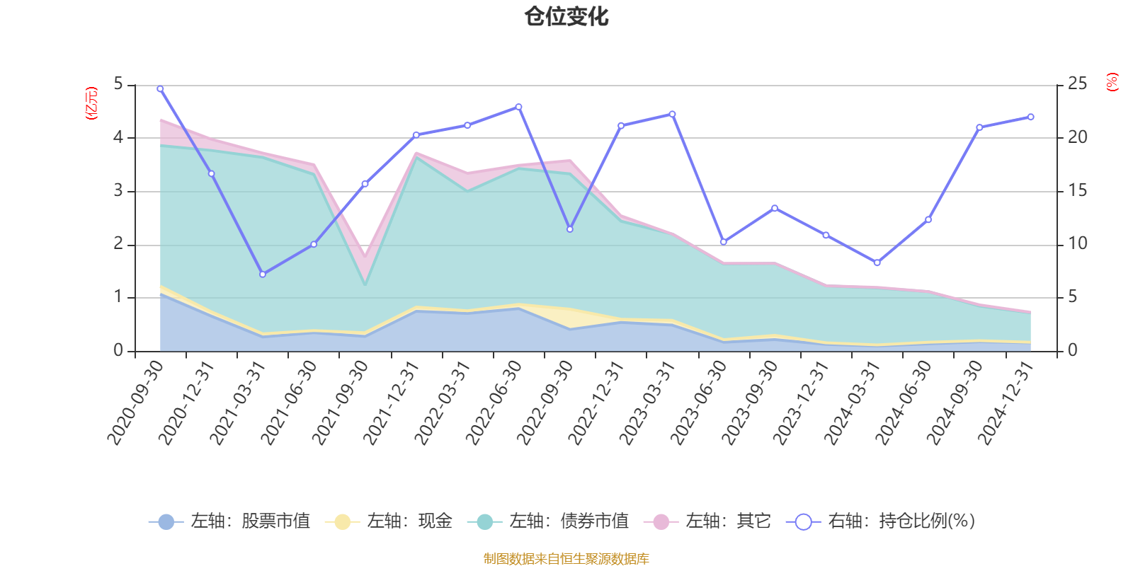 据定期报告数据统计,近三年平均股票仓位为16.44%,同类平均为18.69%。2020年三季度末基金达到24.64%的最高仓位,2021年一季度末最低,为7.22%。